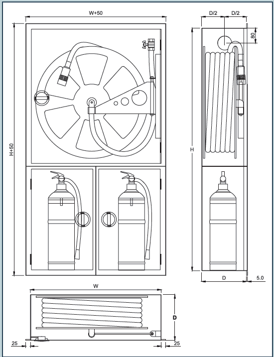 gömme montajlı bir dolaptır. Makara 180° asılı bir desteğe sabitlenmiştir ve kabinin sağ tarafına