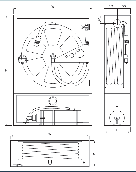 kabinli sıvaüstü montajlı bir dolaptır. Makara 180° asılı bir desteğe sabitlenmiştir
