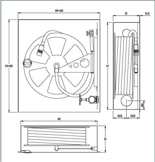sıvaüstü montajlı bir dolaptır. Makara 180° asılı bir desteğe sabitlenmiştir
